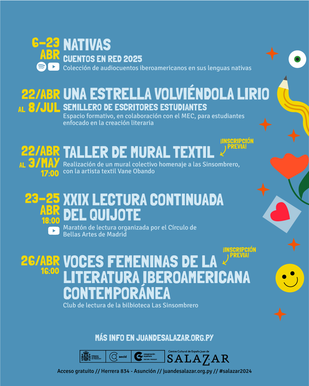 Desde el Centro Cultural de España Juan de Salazar concebimos la literatura como un espacio de encuentro, recuerdos y nuevas vivencias. Por eso, en esta Semana del Libro, abrimos las puertas para celebrar las voces que han marcado nuestra historia y aquellas que siguen escribiéndola.